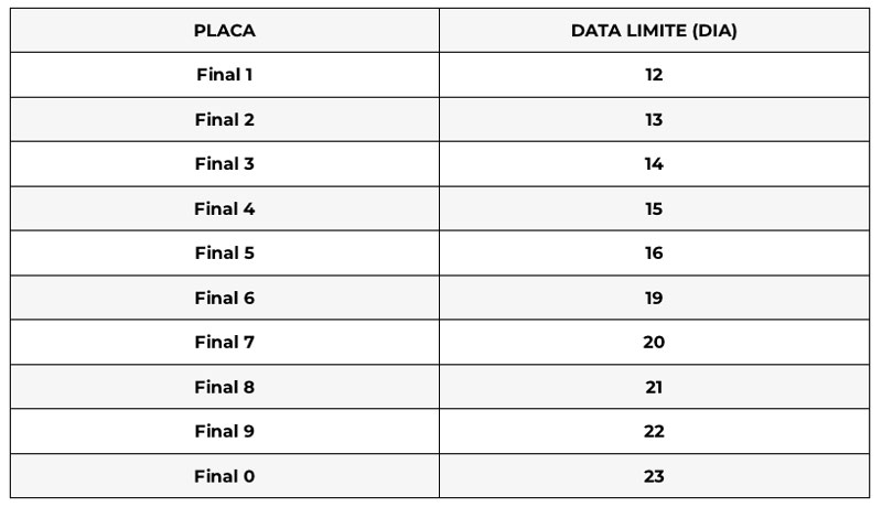 Outra opção é o pagamento à vista no mês de fevereiro, sem desconto, ainda seguindo as datas do final de cada placa.