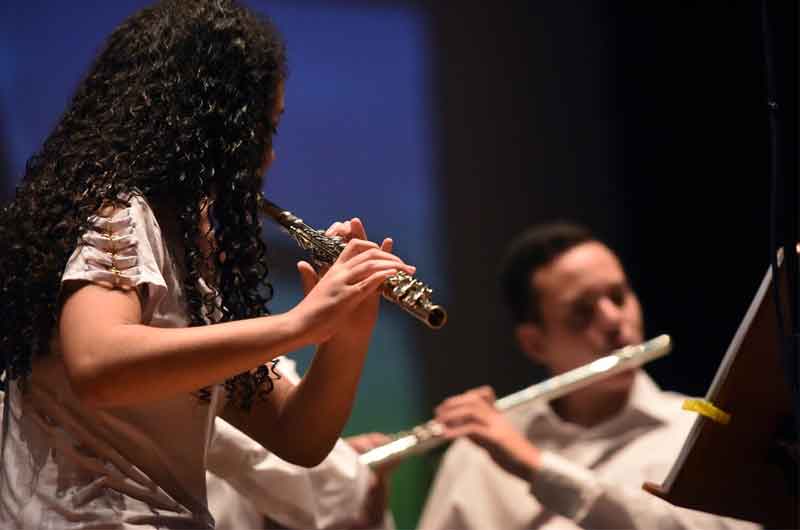 – Estudantes a partir de 10 anos têm a possibilidade de aprender violino, viola, violoncelo, contrabaixo, saxofone, trompete, trombone, flauta, clarinete e percussão